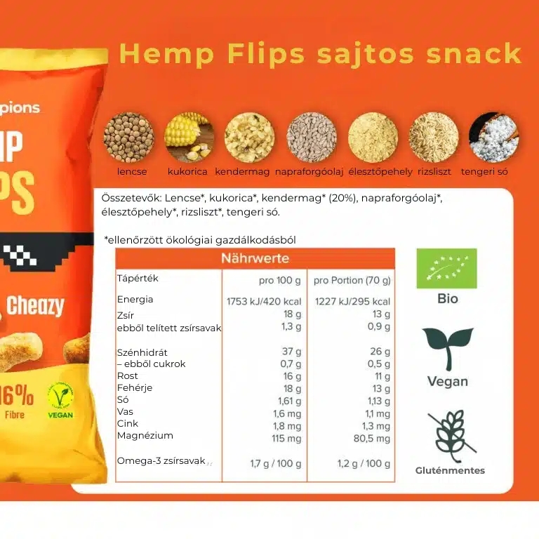 A Hanf Flips Cheazy sajtos ízű snack egy valóban új generációs snack: kizárólag természetes, organikus összetevőkből készül – lencséből, kukoricából és 20% kendermagból. Ennek köszönhetően 18% fehérjét, 16% rostot tartalmaz, és kevesebb zsírt és szénhidrátot, mint sok más ropogtatnivaló. A Hemp Flips Cheazy sajtos ízű 100%-ban természetes bio összetevőkből készül. Tökéletes nassolnivaló, hiszen kevesebb zsírt és szénhidrátot tartalmaz, mint más hasonló nassolnivaló.