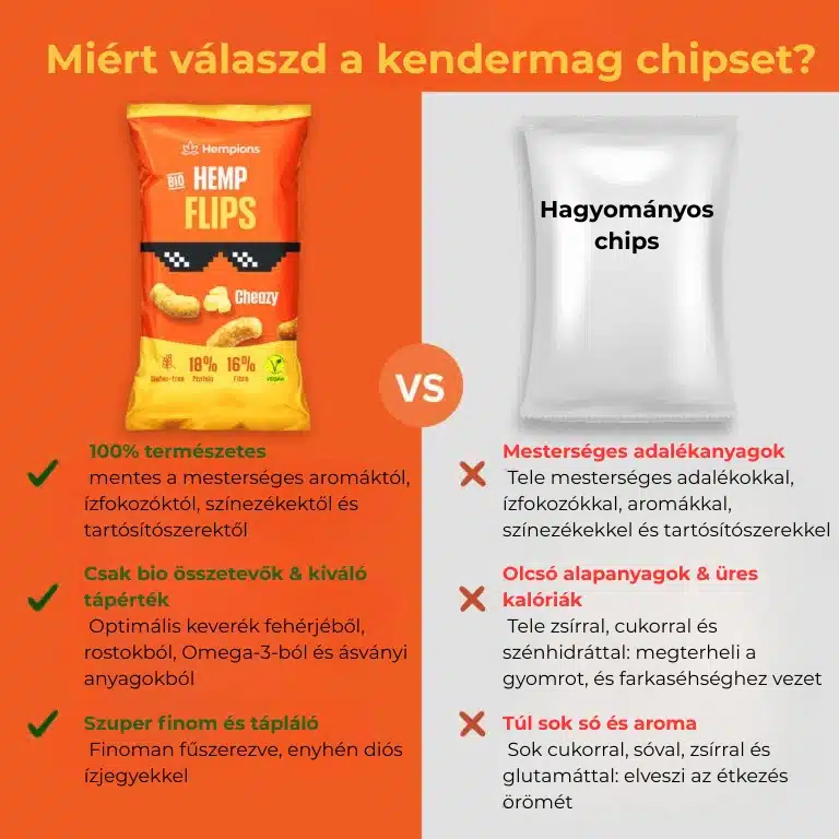 Míg sok hagyományos sajtos chips üres kalóriákat és túlzott mennyiségű zsírt tartalmaz, addig a Hanf Flips Cheazy könnyedebb, lassabban felszívódó, jóllakottság-érzetet biztosító alternatívát kínál. A termékben található kendermag hozzájárulhat az egészséges szív- és érrendszer működéséhez, a bőr regenerálódásához és a hétköznapi energiaszint fenntartásához.